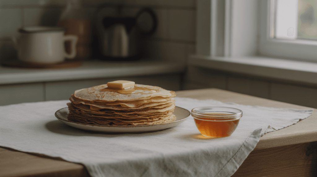Если поминки выпадают на постный день или вы хотите приготовить блины без яиц, подойдёт рецепт на кефире с содой. Такие блины получаются чуть толще, с приятной кружевной текстурой.